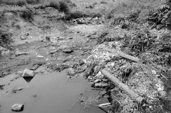 然而一部分污水流在了隔挡以外,这些污水呈现出浓浓的灰色,散发出一股恶臭。还有另外一部分污水呈现出深绿色,表面覆盖着不少生活垃圾和杂物。因为虞河河床长时间干涸的缘故,河床底部覆盖着很多的生活垃圾。