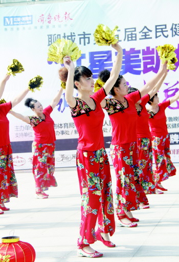 枫润舞蹈健美中心的扇子舞《我的家乡大平原》尤其引人注目,这些上年纪的阿姨们身姿曼妙,柔情似水,与东昌府人民医院年轻姑娘们性感火辣的啦啦操相比,也不遑多让。