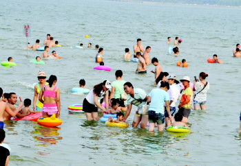 戏水纳凉 27日,聊城市民在沙滩浴场戏水纳凉,当日聊城天气炎热。沙滩浴场成了避暑的好地方,人气爆棚,每天前来避暑的市民突破5000人次。 本报记者 邹俊美 摄