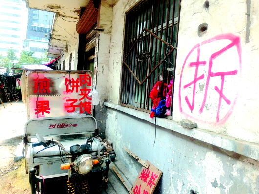 楼外墙上用红油漆写的“拆”字分外显眼,与热闹的过道和楼里往来人的氛围十分不合。顺着过道向前走,该楼的东侧是一片被拆后的废墟,建筑垃圾上面还有不少生活垃圾。