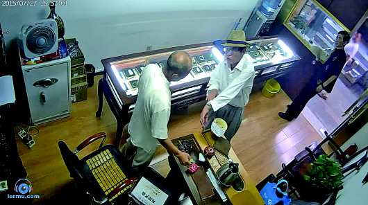 调取店内的监控录像,陈先生发现玉雕真的是被穿深蓝唐装的老头偷走的。监控录像显示,在进店前,穿唐装的老头就在店门口停留了约20秒,一直盯着橱窗里的玉雕看,进店后,他还一直在橱窗附近徘徊,最终在戴帽子老头的掩护下,趁机将玉雕从橱窗中取走,然后装作若无其事地问陈先生绿植的名字。