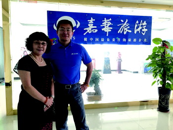 嘉华旅游董事长、总经理张明与志愿者张大姐合影