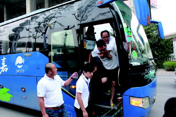 ◥志愿者背公益团团友下车