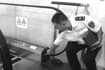 执法人员检查扶梯的应急按钮。本报记者 高雯 摄