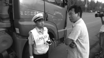 危化品运输车的驾驶员正在接受民警检查。 本报记者 孟杰 摄