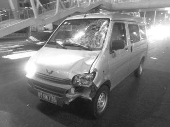 女子马路中间被撞,面包车玻璃撞碎。 通讯员供图