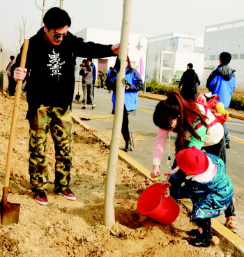 他们有大学教授,有农民工,有企业老板,有政府官员,也有在校学生……但融入植树的队伍,他们是植绿护林志愿者。挖坑,扶苗,培土,浇水,挥锨挖坑,扶苗培土,提水浇灌,将一株株树苗扎根蓝天下。每年数百户家庭相约春天,在河畔路旁共植一片公益林,亲手栽植家庭希望之树,并为“爱树”起好名字挂在树上,孩童们成为护绿小天使,与小树一同茁壮成长。