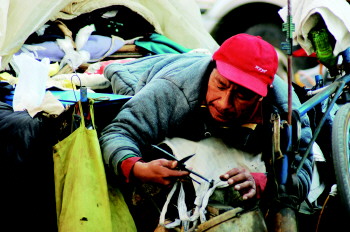 2010年,下身瘫痪的赵安昌正在专注磨着手中的剪刀。