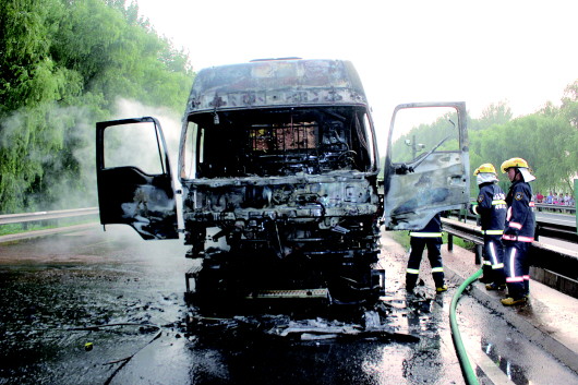 18点20分特勤中队到达现场,现场浓烟滚滚,处于猛烈燃烧阶段,车辆驾驶室以面目全非,特勤中队指挥员当即下令单干线出两只水枪在车的左右两侧进行灭火。十分钟后,现场明火被扑灭,中队进一步对车体进行冷却并对漏油地面洒水稀释,18时40分在确认无复燃现象后,中队将现场移交给交警收捡器材撤回。