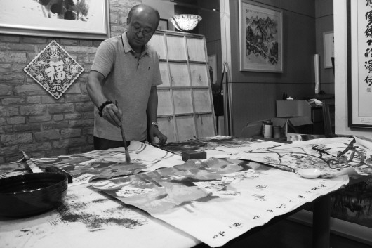◥赵先闻在创作为刘建源捐赠的画作。