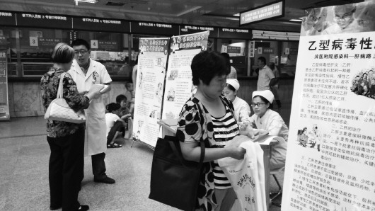 滨医附院感染性疾病科副教授刘同刚正在向市民讲解肝炎知识。 本报记者 张牟幸子 摄