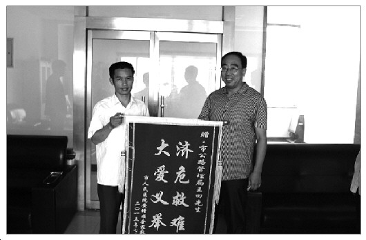 本报7月28日讯 (记者 于鹏飞) “我们是带着同学的嘱托来感谢王老师的,他是我们的救命恩人,我们从心底感谢他。”7月27日,躺在病床上的安先生特别委托他的同学为在市公路局工程处上班的王田送来一面绣有“济危救难,大爱义举”的大红锦旗。
