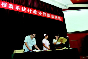 本报7月28日(记者 唐菁 通讯员 齐志成) 28日,市档案局在山东理工大法学院模拟法庭举行全市档案系统行政处罚执法演练,市档案局根据实际工作中存在的档案违法的典型案例,模拟设计了5个案例,对不规范治档的行为予以处罚,最高处罚10万元。