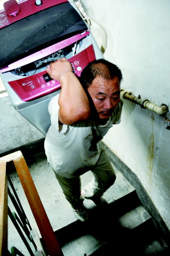 已经45岁的杨师傅拖着缓慢沉重但不间断的步子一层层把冰箱背上5楼。“搬家是体力活,更是技术活,搬的物件大,但是楼梯又窄,怎么在不碰损家具的基础上,把它安全的送到家里,没个几年功夫不行,我搬了快10年了,我现在就能保证,不会碰掉家具的一块漆。”