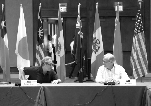 7月28日,在美国夏威夷毛伊岛,美国贸易代表迈克尔·弗罗曼(左)和澳大利亚贸易与投资部部长安德鲁·罗布出席TPP会议。 新华社发