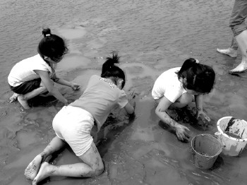 第二天,我们来到了东营市广利港,跟随渔船去赶海。坐船大约40分钟就赶到了赶海地点,此时海水正在慢慢退潮,我的女儿已经等不及了,卷起裤管、光着脚丫踩在浅浅的海水中,水中的小螃蟹成为孩子们追逐的目标,他们把捉到的小螃蟹放到小桶中。螃蟹不是我们的主要目标,蛤蜊才是我们的核心目标呢,挖蛤蜊是有诀窍的,用脚在海水浅滩转圈踩着,不一会淤泥中的蛤蜊就会钻出来,只需把蛤蜊放到小桶中即可,不一会大家都学会了挖蛤蜊的诀窍,大家都在海滩上转着圈扭啊扭啊,成了一道别致的风景线。快到中午的时候,我们已经挖到了近一桶的蛤蜊,带着满满的收货上岸了。