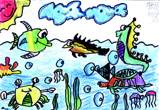 我画的题目是《海底大狂欢》。陆地上有小朋友的欢声笑语,有川流不息的车辆,海里是另外一个极其热闹的世界:看,两条鱼儿露出水面,好像在跟太阳公公招手呢!海马也出来了,他好像在看空中的云哥哥、云弟弟呢!螃蟹先生张开他的大钳子忙着捕食呢!鱼儿在欢快地吐着泡泡,一个比一个大,一个比一个远,映着阳光闪烁出美丽的光芒。海草小姐随着水的节奏在跳舞,可爱的水母也加入了这场激动人心的大联欢。