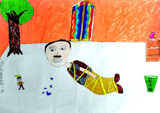 原来,大巨人杰克回来了,看到一个小东西在偷吃他准备的食物,就在后面把小不点捏了起来,小不点费力地挣扎着,咬了大巨人杰克一口,大巨人杰克手一松,小不点趁机钻进了巨人的袖子,小不点爬上爬下,弄得巨人杰克浑身痒痒,在地上直打滚。