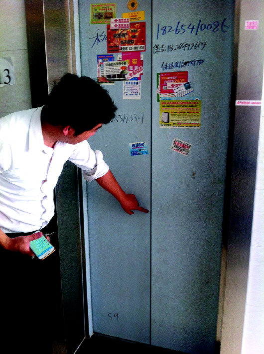 郭先生向记者指示撬开电梯门的位置。 本报记者 郑帅 摄