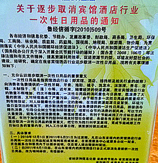 对于市民反映的酒店客房内有偿提供一次性日用品这一问题,工作人员让记者看了一份由省经济和信息化委、省政府节能办等于2010年10月20日联合下发的《关于逐步取消宾馆酒店行业一次性日用品的通知》,通知中提出,“为提高资源利用效率,促进资源节约型、环境友好型社会的建设,经研究确定在我省宾馆酒店行业逐步取消一次性日用品”。并分为两个阶段实施:2010年12月1日至2011年5月31日为过渡期,凡在山东省境内的宾馆酒店行业不再将一次性日用品配送至每间客房或餐桌,在客房服务中心或服务台统一配备,并在服务台和客房内予以提示说明,仅在客人提出需要时配送;自2011年6月1日起,在山东省境内的宾馆酒店行业正式取消免费提供一次性日用品,改为明码标价,有偿提供。也就是说,酒店有偿提供一次性日用品是有明文规定的,该酒店是在执行这一规定。