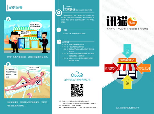 他说,无论原有店面是超市、服装店、网吧、美容美发店、报刊亭、杂货店、精品店、小餐厅、校园店、药店、数码店还是其他类型的店面,都可以免费升级成为云媒讯猫智能店。只要安装云媒讯猫智能化商业系统,就可以直接成为覆盖全山东的11万家智能化商业联盟网络体系的一分子,享受这个庞大的智能化商业网络带来的无限增值商机和发间展空。而山东之后是全国,100万家的店铺将因智能化商业系统重焕光彩。而聚拢了这100万家店铺的山东云媒科技也必将成为一个商业的奇迹。
