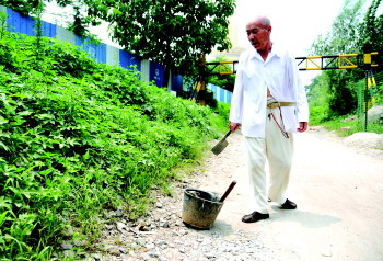 “我以前在铁路局建筑段工作,木工、瓦工、钢筋工都干过。”他介绍,修路前,他花了约一周,从附近公路边堆积的建筑废料中,找来石板和砖块。由于家离修路地点比较远,他找来自行车,一趟趟从家中推着车运送搅拌好的水泥浆。“三天来,运了多少次记不清了,前前后后不下几十次吧。”老人称,由于天气炎热,他修路时才穿了一身白衣,不想被路人拍到发到网上。