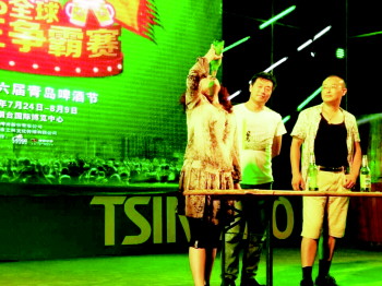酒王争霸赛现场,迎来一位女将,一口气吹完一瓶啤酒,参赛的男同志都看呆了。 本报记者 秦雪丽 摄