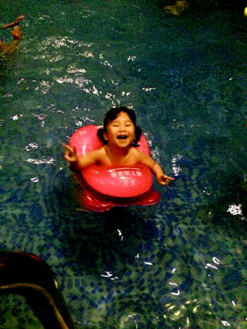 言归正传,带着我家小主到达游泳地点后还是震撼了一把,地上地下几层楼的幼教中心,各种游乐设施、玩具、书籍琳琅满目啊,再想想我等捏泥巴的童年……游泳池的设施也不错,室温和水温都很合适,教练拿出一堆游泳圈让闺女挑,结果我家小主抱起一个粉色小熊造型的泳圈就不撒手了,好吧就是这个了。然后就是下水了,由教练全程贴身保护,这待遇,啧啧……原本以为闺女下水后会害怕,但是我家小主出乎我意料的兴奋啊,前进、后退、转身、侧移,搂着泳圈就开始了花式“扑腾”,玩得那叫一个欢实啊!还不时地扮个鬼脸、卖卖萌什么滴,甚至学着旁边哥哥姐姐的泳姿伸出小腿蹬啊蹬啊,真像一只快乐的小美人鱼,让咱这当爹的看了着实心醉啊。
