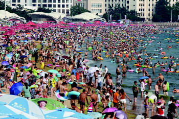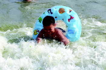 29日,天气炎热,第一海水浴场里游客众多,如同“下饺子”。 本报记者 杨广帅 摄