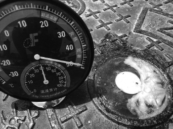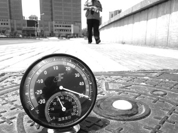 中午12点,记者在望岳东路附近测试温度,温度仪上显示为40摄氏度,暴露在阳光下十分钟,温度仪已经爆表,比50摄氏度还高。 12点30分,记者拿着预先准备好的鸡蛋和温度计等物,开始寻找适合煎鸡蛋的“煎锅”,最后选择了文化艺术中心附近的一个井盖,此时,此井盖被太阳暴晒。