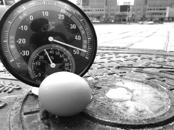 井盖煎鸡蛋,引起了不少路人的好奇和关注。许多路人走近井盖仔细瞧瞧摊在井盖上的鸡蛋和气温仪,感叹气温太高。有些车子经过甚至会停下摇下车窗瞧一瞧,但瞬间又被热浪打缩回车内。下午1点40分,时间过去了50分钟,鸡蛋已经熟了,散开的蛋黄已经完全凝固成一层“硬壳”,拿手按压能感觉到蛋黄已全部凝固,散落在周边少量的蛋清已经蒸发的只剩下痕迹。