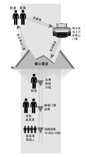 韩某和张某某、聂某某等人是一个固定的倒票团伙,从2013年开始,他们一直通过涂改使用过的泰山门票卖给游客或带领游客绕过检票口的方式谋利。