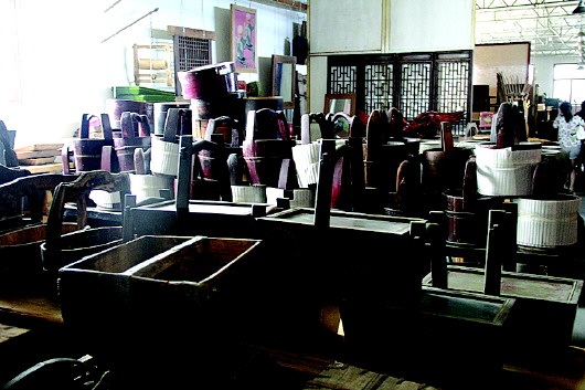 张丙春的聚源斋就坐落在文化街的中心位置,朴素而不失品位的装修风格在沿街店面中十分显眼,门口随意摆放着石狮子,店内还有各式各样的木门,其中不少门上的金属零件也已经锈迹斑斑,织布机、木水桶、煤油灯……在上世纪乡村才能见到的物品被归置在店内的各个角落。这些略显“土气”的物品在艺术家们看来,可是一个很好的创作题材,据说平时也会有很多艺术家来这里寻找创作灵感。