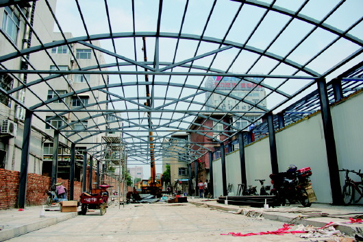 7月29日,记者在剧场街看到,北面的施工现场正在安装大棚钢架结构,南边的正在铺设排水管道,不远处挖掘机还在不停作业。“我们是按照梯次开展、压茬推进的方式来改造的,改造完成后,原有经营业户,按照1:1的比例用旧房换新房,新房面积有超出的,按照建筑成本缴纳费用。”市中街道办事处副书记赵新涛介绍,同时对在规定期限内拆除违章建筑的,鼓励他们承包新建经营场所。在改造期间,躲迁的商户可减免一个月房租,不足一个月的按照一个月计算。“市中办事处是7月7日正式进场的,由于准备工作充分,当天下午我们向全体商户正式发放了书面通知,很多商户纷纷自己拆迁,不到3天,9日就基本拆迁完毕。”