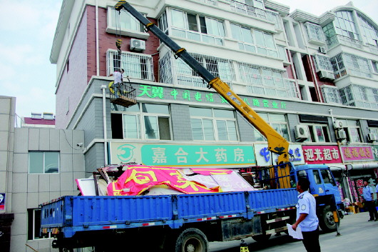 “再高一点,往东边来一些……”29日上午,记者在位于黄河八路渤海五路华天滨中家园南门附近看到,市东城管执法队二中队队长陈吉军正在指挥一辆塔吊移动,好让工作人员方便清理违章标识。自从接到创城迎审的工作以来,陈吉军和他的队友们每天都奋战在一线,时值盛夏,已经先后有3名执法人员中暑,其中包括陈吉军本人。在他们的努力下,滨州市环境整治、创城复审等工作取得满意成绩,市民的生活环境也越来越安全舒适。