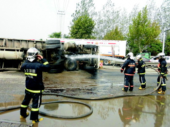 28日9时16分,市公安消防支队张店区大队南定中队接到119指挥中心命令。到达现场后发现,一辆拉石子的半挂车侧翻于路中,车内并无人员被困,但是驾驶员不知去向,消防官兵无法了解现场情况,在现场,油箱已经发生泄漏,泄漏油品为柴油,流淌面积较大。由于天气炎热,气温较高,极容易发生意外情况,为了防止意外发生,消防官兵立即通知现场交警封锁事故路段,设立警戒组,现场杜绝火源。