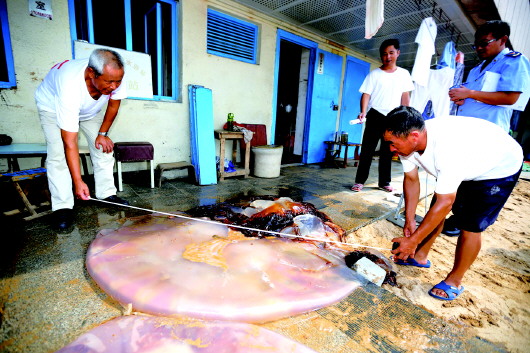 第六海水浴场捕捞上来的“海蜇王”长1.8米,宽1.74米。 本报记者 张晓鹏 摄(资料片)