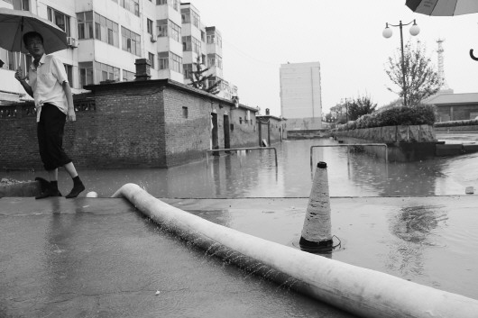 黄河十路渤海八路邮政局小区积水严重,动用抽水泵往外抽水。 本报记者 王晓霜 摄