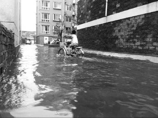 3日上午,在惠民县世纪花园小区,旧楼房附近积水严重,但是较深的积水却成了孩子们的“乐园”,他们结伴骑车在积水中享受“水花四溅”的感觉。