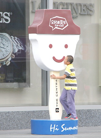 时间:2015年7月11日 自述:面对这么大一个诱人的笑脸雪糕,小朋友也回以大大的笑脸。 点评:要是换一个真的大雪糕上来,保证大朋友们也会报以大大的笑脸的。