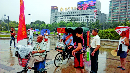 在这之前,早上7点,他们刚在泉城广场的国旗下进行了庄严的宣誓,铺开一张写着“庆祝抗战胜利七十周年草根艺术家王洪利从济南万人签名到北京”的条幅,征集大家的签名。
