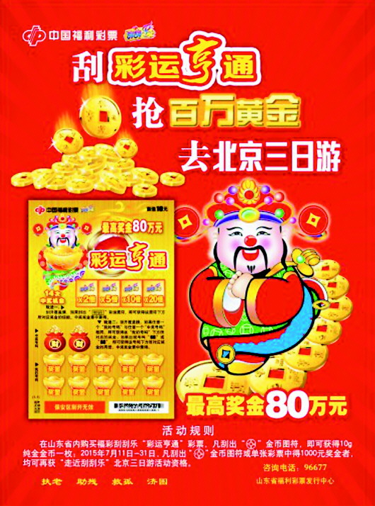 在37010669号福彩专营店,前来刮“彩运亨通”的彩友们早已围了个水泄不通。大家彼此心照不宣,默默地以行动向80万大奖和纯金金币、北京游发起猛烈的进攻。人群中一位看起来十分老到的彩友,一边卖力地刮着“彩运亨通”,一边不时“点评”两句:“我平时就很喜欢玩刮刮乐,每天都要刮,为了玩刮刮乐,我把二十年的烟瘾给戒了,把这些烟酒钱省下来当彩资。一方面算是为我的健康进行储蓄,另一方面也算是奉献爱心吧。”一名彩友说,他之所以集中精力刮“彩运亨通”呢,是因为这个票种除了80万大奖、11个奖级之外,还有抢金币和北京游的额外设奖。