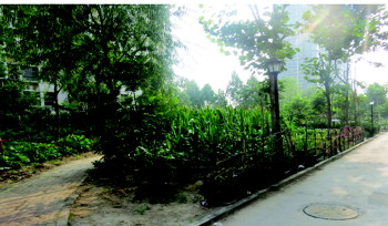 小区内的绿化带中长满了蔬菜,玉米已经一人多高。