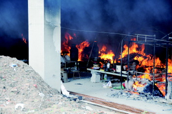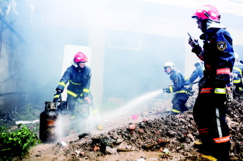 消防员冒火从火场搬出三个已被烧漏的煤气罐。 本报记者 马志勇 摄