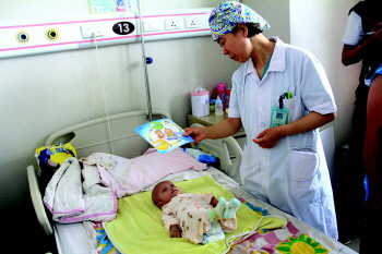 4日,在妇儿医院病房,经手术治疗后,小睿泽恢复得很好,还会配合护士互动和玩耍。 吕璐 摄