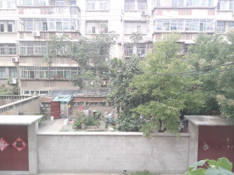 记者顺着张先生指的方向看到,新建的围墙呈东西走向,两扇红色的铁门将墙体分隔。在张先生居住的13号楼中单元二楼处,记者从上向下看到,围墙中间位置有一面南北走向的石砖墙,将被圈起来的院子从中间隔成两户。