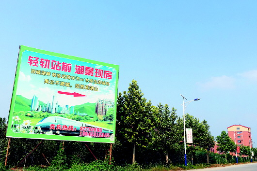 R1线玉符河站点附近的楼盘已经打出了“轻轨站前”等广告吸引人气。 本报记者 王媛 摄