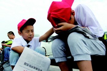 7月31日早上,当父母带董佳昕、董佳琪来领报纸的时候,佳琪脸上一直都显的非常委屈,因为在前一天卖报的时候,弟弟想到汽车站去,但是爸爸觉得在火车站卖的挺好,所以拒绝了佳琪的请求。就因为这事,弟弟闹起了小脾气,一直到卖报纸的时候,情绪也不高,有时候还坐在一边低着头捂着脸。这时候,佳昕看到弟弟的变化,赶紧跑过去,拍着佳琪的肩膀安慰着:“有哥哥在没什么大不了的,在哪不是卖,不是还有我陪着你呢。”听到哥哥的安慰,佳琪的心里也好受了很多,他重新打起精神来跟哥哥一起努力。