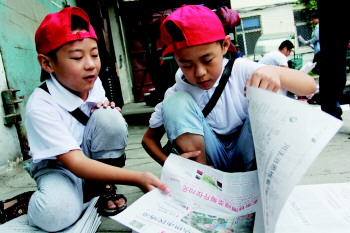 弟弟卖报受挫哥哥在一旁给他加油打气。
