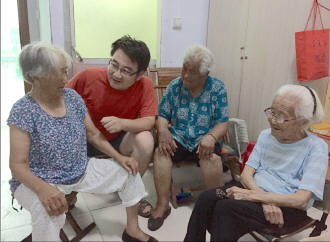 曹阳和公寓里的老人坐在一起聊天。(曹阳供图)
